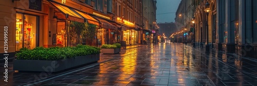street, city, night, rain, wet, pavement, building, light, shop, urban, evening, dark, illuminated, atmosphere, romantic, calm, serene, cosy, quiet, peaceful, tranquil, stillness, gloomy, picturesque, charming, beautiful, scenic, view, perspective, architecture, window, door, signs, street light, awning, plant, downtown, town