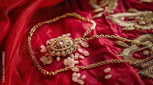 Raksha Bandhan background with an elegant Rakhi and Rice Grains on red cloth textured background.