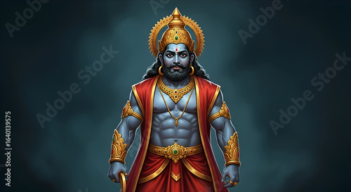 Rama blue skinned god standing with golden crown on dark cosmic background art