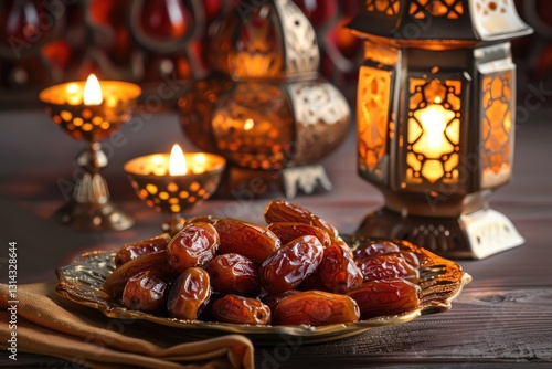 Ramadan banner with date fruits, lanterns, and candles, symbolizing the Muslim holy month with warm lighting and inviting atmosphere