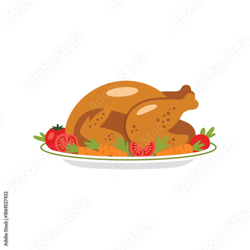 Ramadan Iftar Roast Chicken Vector Illustration with Vegetables on Plate