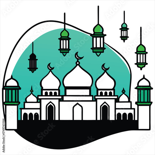 Ramadan Mosque with Hanging Lanterns,Islamic Eid Mubarak Vector Illustration,Ramadan and Eid Mubarak Background,Ramadan and Eid Mubarak Background