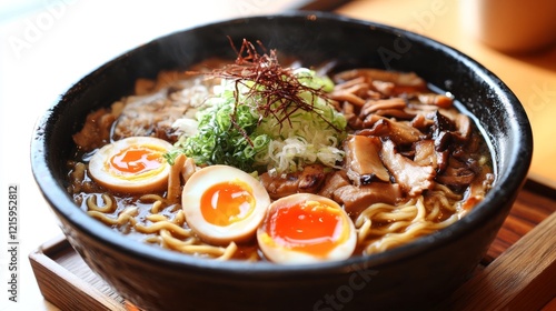 Ramen with eggs and meat in a bowl on a wooden table. Delicious ramen bowl with chicken, eggs, beef and vegetables. Soup ramen. Ramen noodle. Korean or Japanese food concept. Copy space. Close-up view