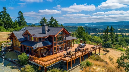 ranch, home, large, deck, view, surrounding, hill, forest, architectural, architecture, beautiful, building, construction, contemporary, dark, driveway, estate, expensive, exterior, garage, grass, house, housing, luxurious, luxury, modern, residence, wall, window