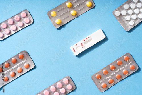 Rapid test for COVID-19 detection of IgM and IgG antibodies to the new SARS-CoV-2 coronavirus. Blue background and many different pills.