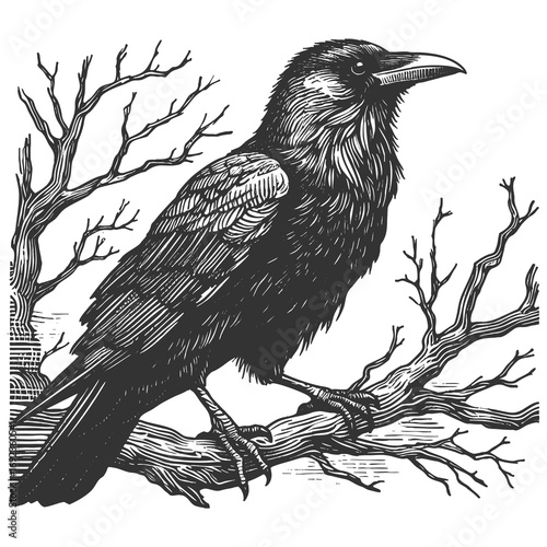 raven sitting on a bare tree branch, symbolizing mystery, gothic themes, and darkness sketch engraving generative ai raster illustration. Scratch board imitation. Black and white image.