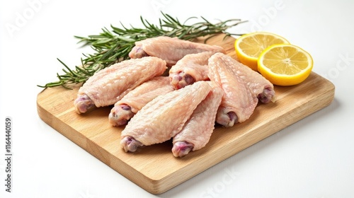 Raw chicken wings with fresh herbs and lemon slices on a wooden cutting board ready for seasoning and cooking preparations