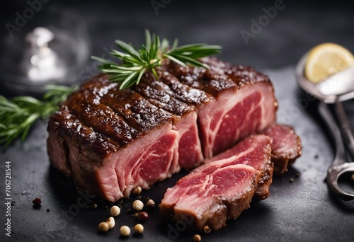 Raw fresh marbled meat beef steak and seasoning on dark metal background