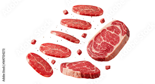 Raw ribeye steak slices with pepper isolated on transparent background, fresh marbled beef cuts and meat cubes for cooking and barbecue