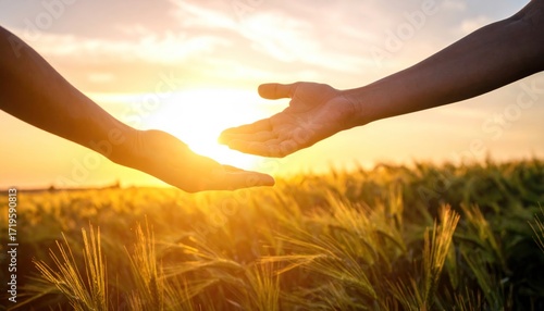 hand, reaching, gold, wheat, field, sunset, arm, sky, sun, warm, yellow, plant, grain, agriculture, connection, togetherness, help, support, hope, offering, rural, nature, countryside, crop, sunlight, ray, grass, summer, horizon, skyline, golden hour, farm, romantic, dreamy, serene, peaceful, closeup, dramatic, backlit, natural, lifestyle, travel, education, health care