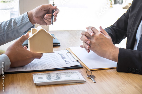 Real estate agent are presenting home loan and giving house, keys to customer after signing contract to buy house with approved property application form