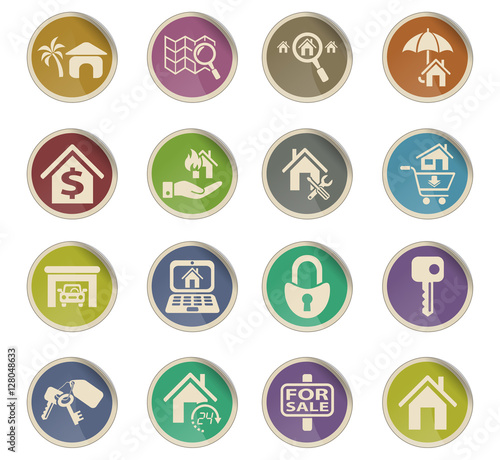 bungalow, house, laptop, lock, icon, symbol, vector, real estate, for sale, key, insurance, map, magnifying glass, search, key, garage, repair, colours, label, sticker, paper, cardbox