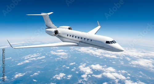 Realistic photo of White Luxury generic design private jet flying over the earth. Empty blue sky with white clouds at background. Business Travel Concept. Horizontal. 3d rendering
