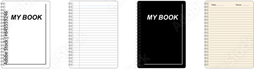 Realistic vector notebook mockup set. notepad with blank cover and spread for your design.Realistic copybook. Set of vector realistic illustrations of a torn sheet of paper from a workbook.
