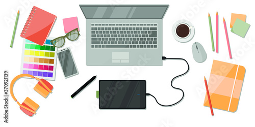 Realistic workplace organization for digital artists. Computer, documents, glasses, coffee, charts, and graphs.