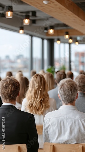 Rear View of a Diverse Group Attending a Presentation in a Bright Conference Room with Neutral Tones and Natural Lighting