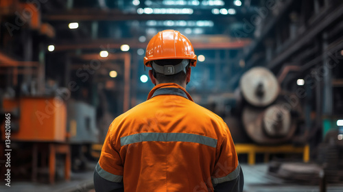 Rear View of a Factory Worker in Orange Protective Gear in a Manufacturing Plant with Heavy Machinery and Steel Structures Under Bright Industrial Lighting