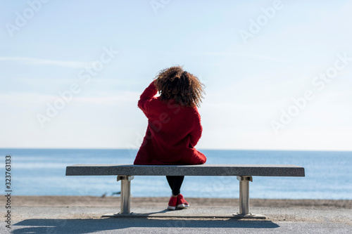 Rear view of a young curly woman wearing red denim jacket sitting on a bench while looking away to horizon over sea