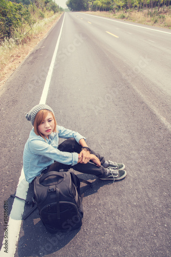 Rear view of a young woman hitchhiking carrying backpack sitting
