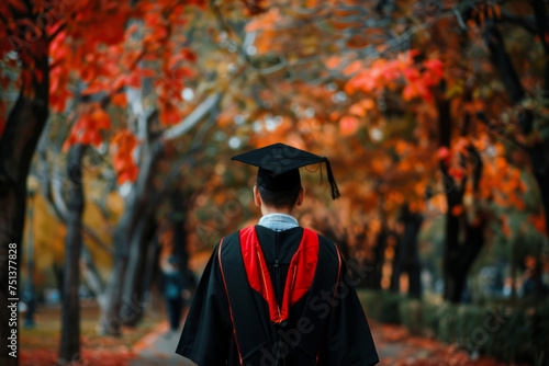 Rear view of man in graduation attire near university. Generative AI