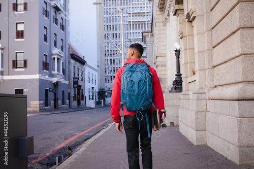 Rear view of mixed race man carrying backpack and skateboard walking in city street