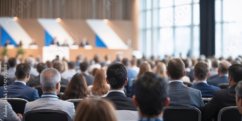 Rear view of people in audience at the conference hall, Speaker giving a talk in conference hall at business event.