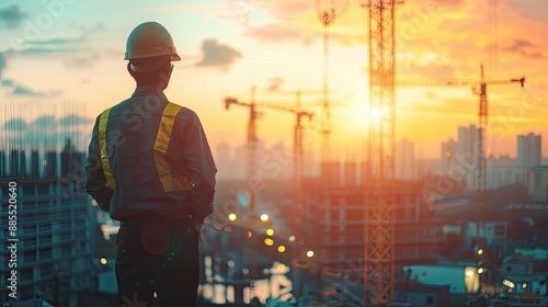 rear view of professional engineer manager standing concentrate focus multi exposure with building construction industry background construstion engineer concept.ai