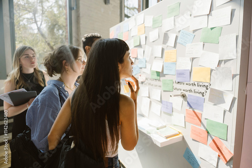 alliance, bulletin board, casual clothes, backview, berlin, day, discussion, europa, photo, contemplating, pensive, four people, color image, togetherness, horizontal, college, indoor, communication, concentration, class, lifestyle, reading, observation, sunlight, student, standing, german, thinking, missy, young adult, university, college students, friendship, western europe