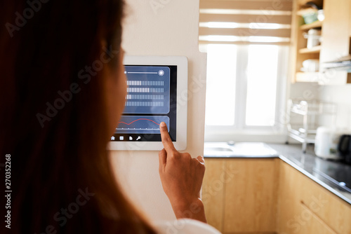 Rear view of young woman making setting of her home with online smart home application which hanging on the wall