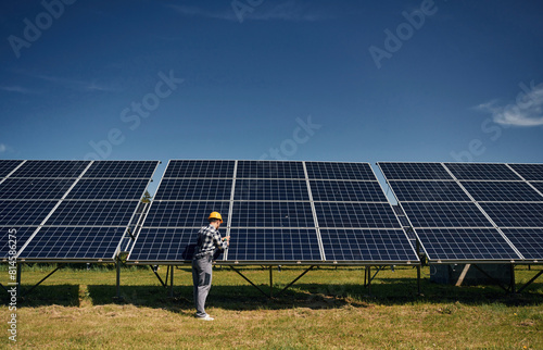 engineer, photovoltaic, solar, panel, rear, back, view, maintenance, outdoors, field, day, man, business, work, electric, technology, environment, background, green, person, energy, 1, eco, connection, mobile phone, power, renewable, grid, generation, station, alternative, array, connectivity, male, white, caucasian, european, ethnicity, photogenic, occupation, professional, smart, guy, facial, expression, hair, stubble field, beautiful, outside