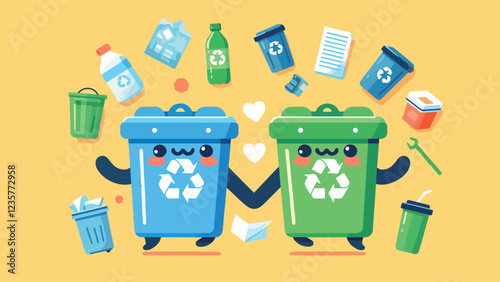 Recycling Duo, two cute anthropomorphic recycling bins (one blue for paper, one green for glass) holding hands and dancing joyfully. Include recyclable items floating around them