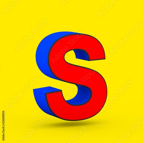 Red and blue superhero letter S uppercase isolated on yellow background.