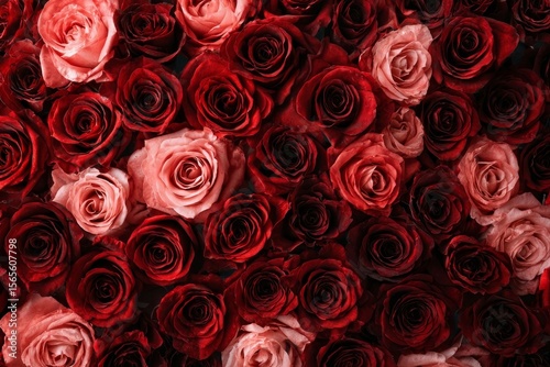 Red and pink roses in full bloom. Perfect for romantic decor or floral designs, this lush arrangement captivates.