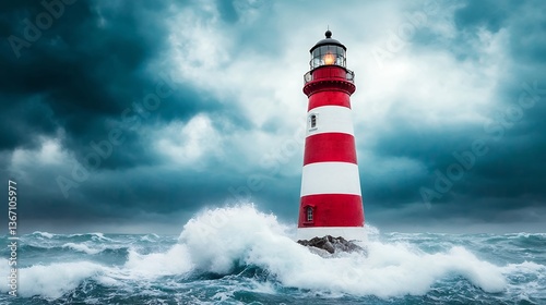 lighthouse, storm, ocean, sea, wave, red, white, weather, dramatic, nature, hope, guidance, beacon, maritime, nautical, coast, cliff, power, resilience, strength, calmness, wind, danger, safety, rocky, turbulent, dramatic sky, light, landmark, emergency