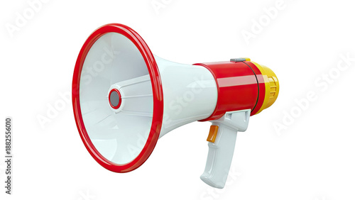 megaphone, loudspeaker, communication, announcement, sound, audio, amplification, protest, rally, speech, warning, alert, public address, portable, electronic, horn, siren, red, white, yellow, device, object, equipment, technology, broadcast, voice, message, promotion, advertising, retro, vintage
