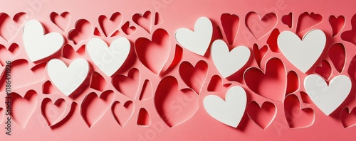 Red and white vertical envelopes with heart cutouts placed on a pink background, symbolizing love and affection. Ideal for Valentine's Day themes