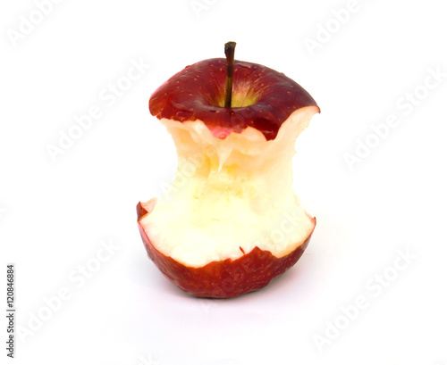 red apple eaten down to the core, on white background.