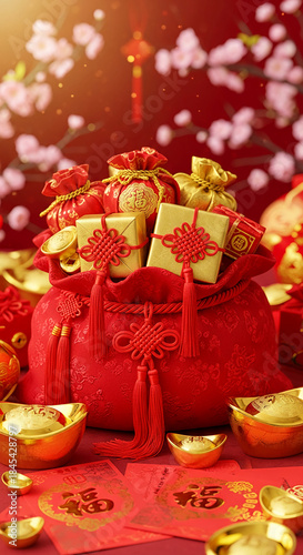 chinese, new, year, bag, gold, box, ingot, knot, tassel, red, gift, decoration, holiday, fortune, prosperity, tradition, celebration, culture, lunar, spring, blossom, tree branch, bloom, flower, ornament, background, festive, wallpaper, banner, pattern, season, event, luck, wealth, card, offering, graphic, design, blank