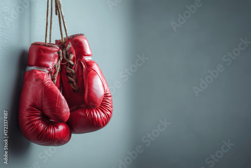 Red boxing gloves hanging on a wall in a training room