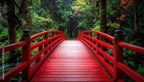 bridge, red, forest, green, nature, landscape, pathway, tree, wooden, paseo, wood, scene, tranquil, travel, environment, lush, foliage, scenic, outdoors, park, path, view, perspective, jungle, dense, vibrant, colours, crossing, structure, botanical, wood, plant, nobody, daylight, exploration, destination, tour tourism, natural, footbridge, escape