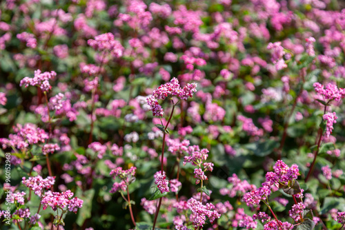 Red buckwheat flowers on the field. Blooming buckwheat. Buckwheat field on a summer sunny day.