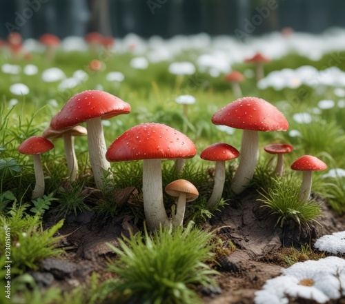 Red capsed mushrooms growing in a white meadow, white background, grassland
