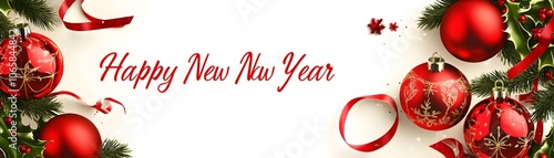 Red Christmas Ornaments with Holly and Ribbon on a White Background