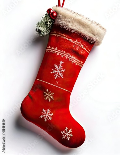 Red Christmas stocking with snowflake patterns, white isolated background.