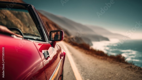 Red Convertible Road Trip Along the Coastline with Ocean View, Adventure and Open Road Freedom