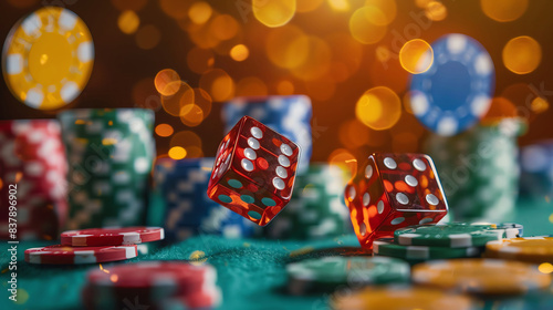 Red dice roll on a green felt table with chips and a blurred background of lights.