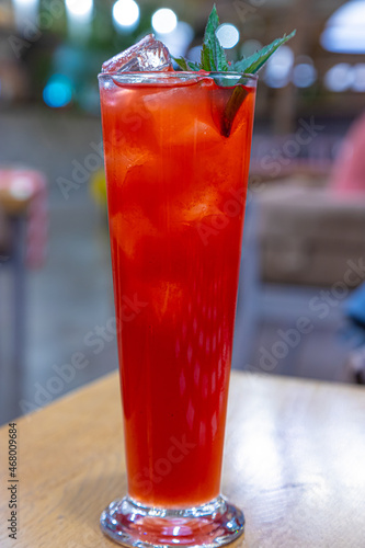 Red drink with ice cubes and green leaf
