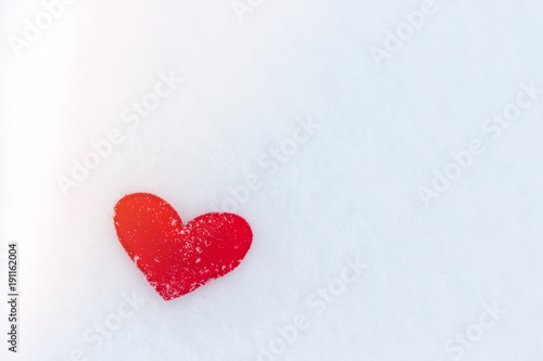 red felt heart figure on snow, winter day with sun glare