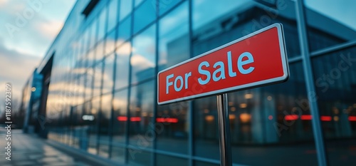 Red "For Sale" sign in front of modern glass building.