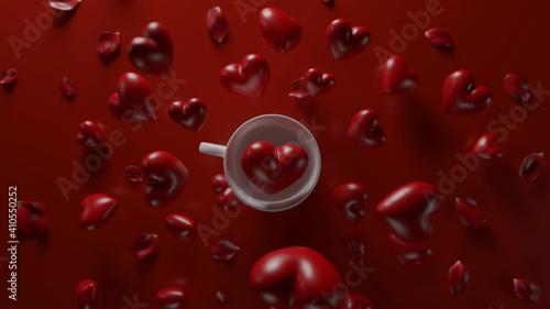 Red heart in white cup and red heart frying around the cup in red background, 3d rendering
